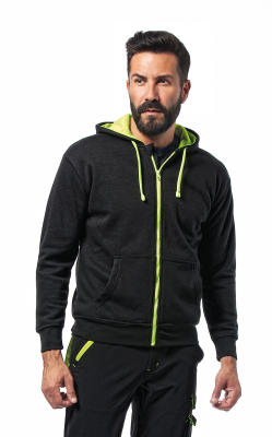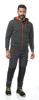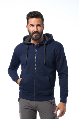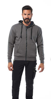 Felpa zip lunga con cappuccio. Due tasche laterali a marsupio.