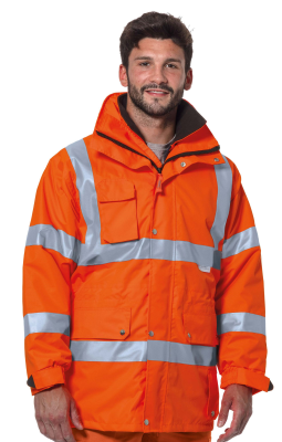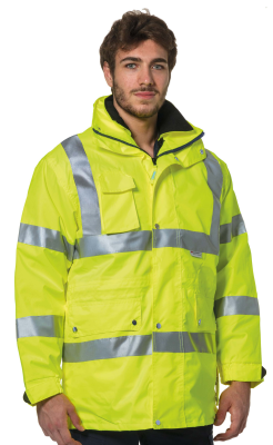Chiusura centrale con cerniera e patta con bottoni, due bande rifrangenti e le maniche. Banda verticale sulle spalle.