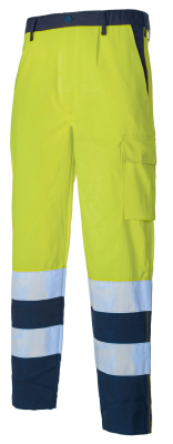 Pantalone alta visibilità con due tasche laterali a filetto, una dietro chiusa con bottone un tascone laterale e portametro.