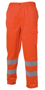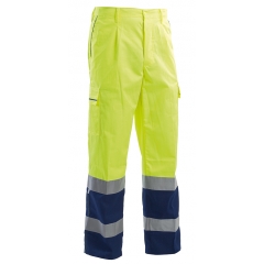 Pantalone alta visibilità con due tasche laterali a filetto, una dietro chiusa con bottone un tascone laterale e portametro.